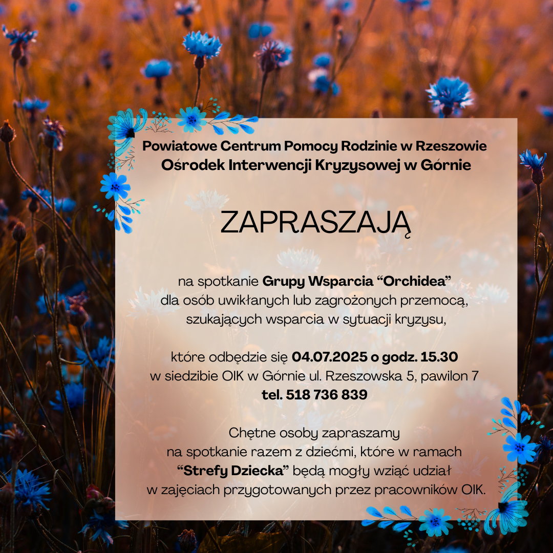 Powiatowe Centrum Pomocy Rodzinie w Rzeszowie, Ośrodek Interwencji Kryzysowej w Górnie Zapraszają na spotkanie Grupy Wsparcia „Orchidea”, które odbędzie się w dniu 04.07.2025 r. o godz. 15.30 w siedzibie OIK Górno, ul. Rzeszowska 5, tel. 518-736-839
