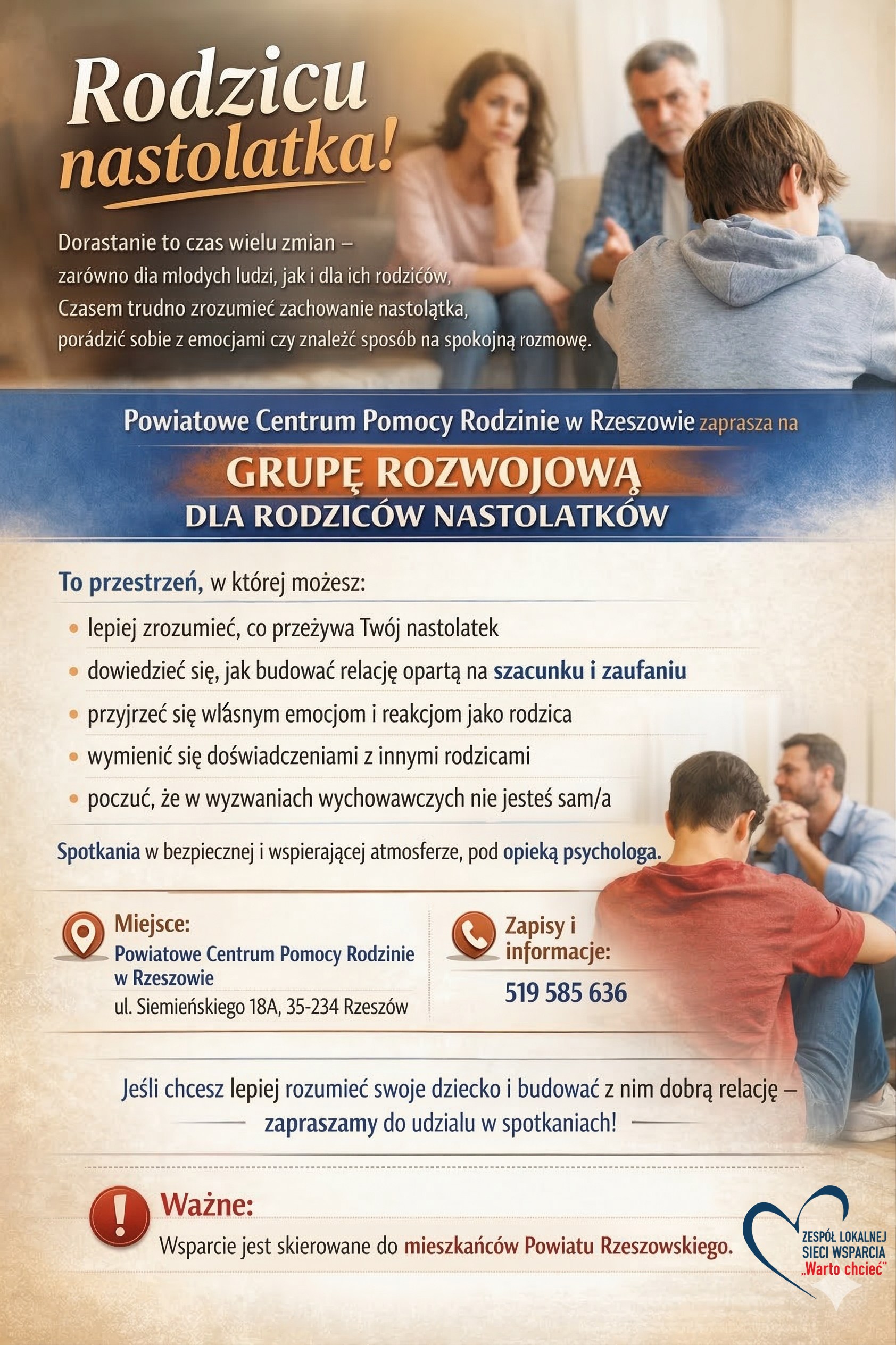 Dlatego Powiatowe Centrum Pomocy Rodzinie w Rzeszowie zaprasza rodziców do udziału w grupie rozwojowej dla rodziców nastolatków.