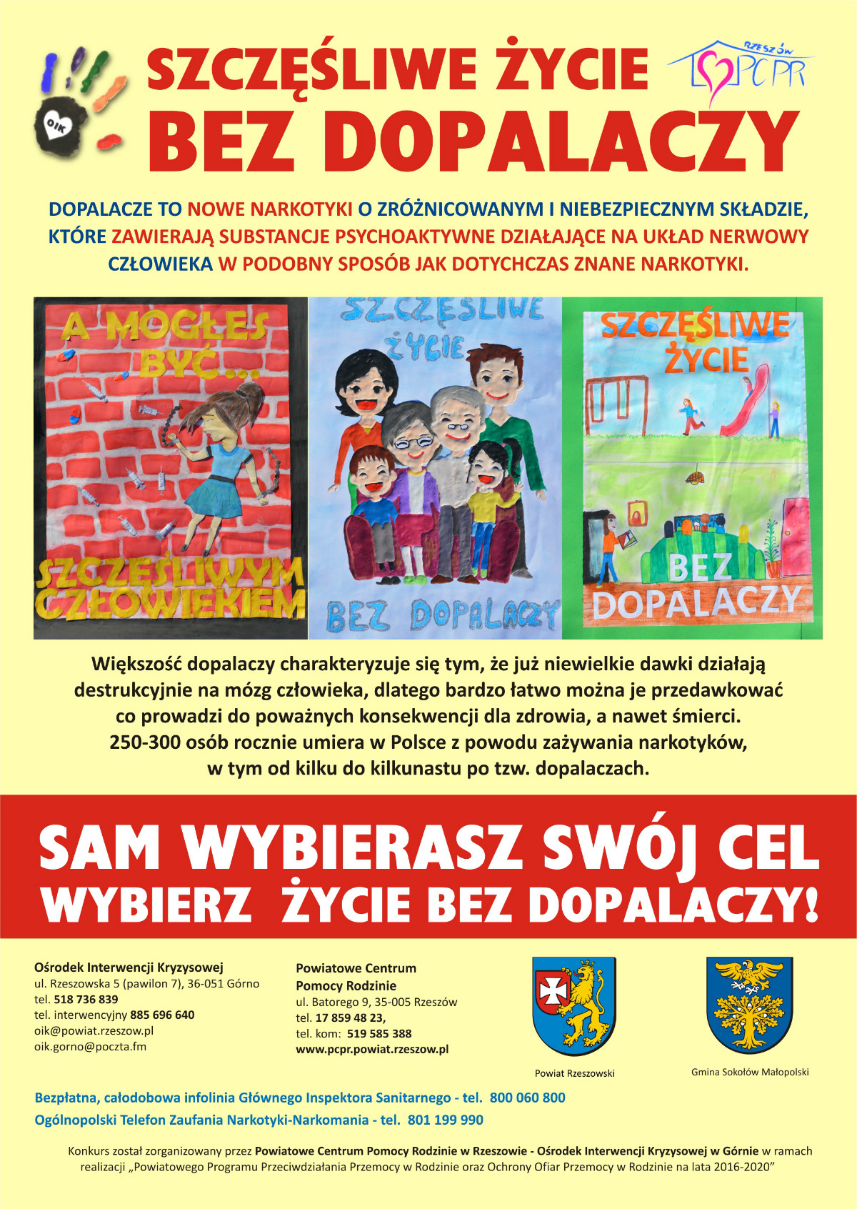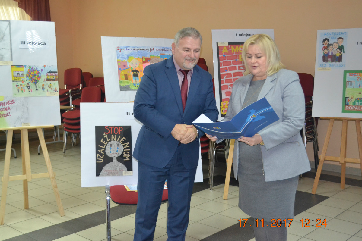 Każda ze szkół biorących udział w konkursie otrzymała pamiątkowe dyplomy, ponadto wszyscy uczestnicy konkursu również otrzymali dyplomy oraz atrakcyjne nagrody rzeczowe z rąk Pana Wicestarosty Marka Sitarza oraz Pani Agnieszki Gabrowskiej – Dyrektora Powiatowego Centrum Pomocy Rodzinie w Rzeszowie. Prace, które zdobyły I miejsce zostały umieszczone na plakacie zawierającym informacje dotyczące dopalaczy, skutków ich zażywania oraz dane teleadresowe instytucji udzielających pomocy.