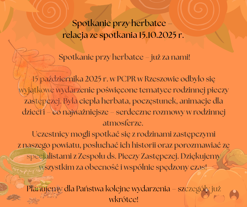 15 października 2025 r. w PCPR w Rzeszowie odbyło się wyjątkowe wydarzenie poświęcone tematyce rodzinnej pieczy zastępczej. Była ciepła herbata, poczęstunek, animacje dla dzieci i – co najważniejsze – serdeczne rozmowy w rodzinnej atmosferze.